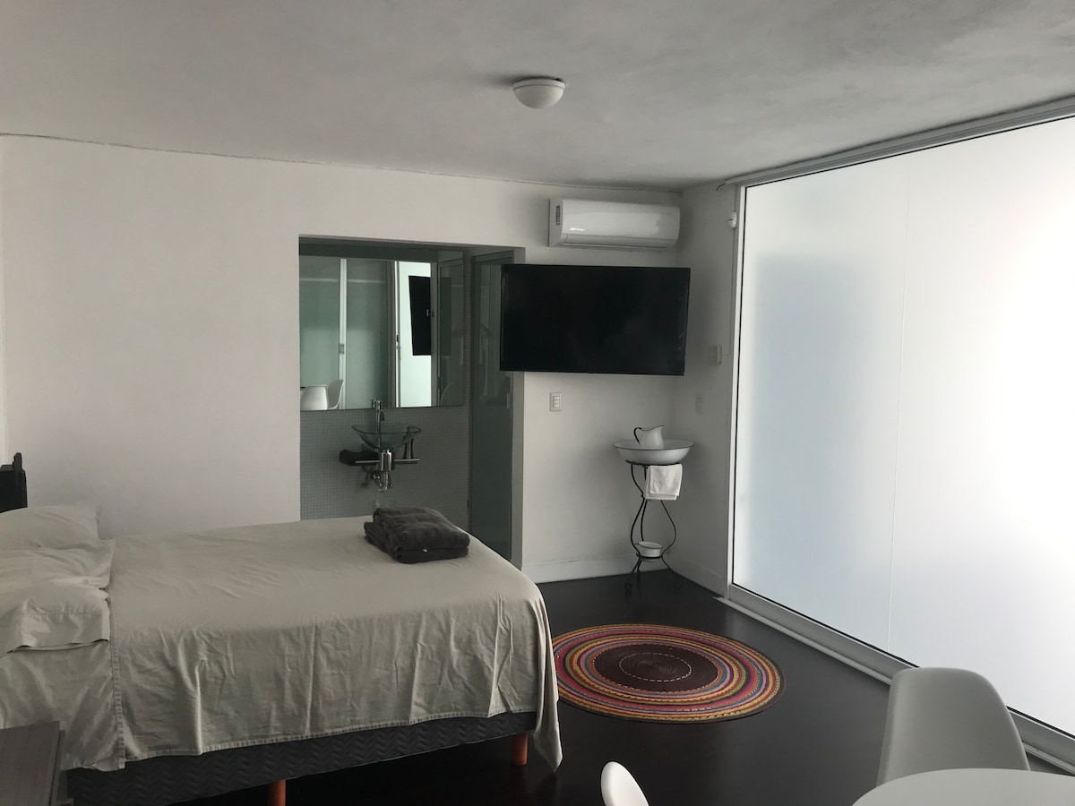 Apartment in downtown Monterrey. Very central, five blocks from Santa Lucía metro station, a few steps from Barrio Antiguo, Parque Fundidora, Paseo Santa Lucia, IMSS Clinic 33 and IMSS Gynecology and Obstetrics Hospital. The apartment features WiFi, a private bathroom, a gas stove, a refrigerator, a Smart TV, a closet, and A/C (mini-split). OXXO and 7-Eleven stores two blocks away. Traditional Monterrey neighborhood, very quiet.