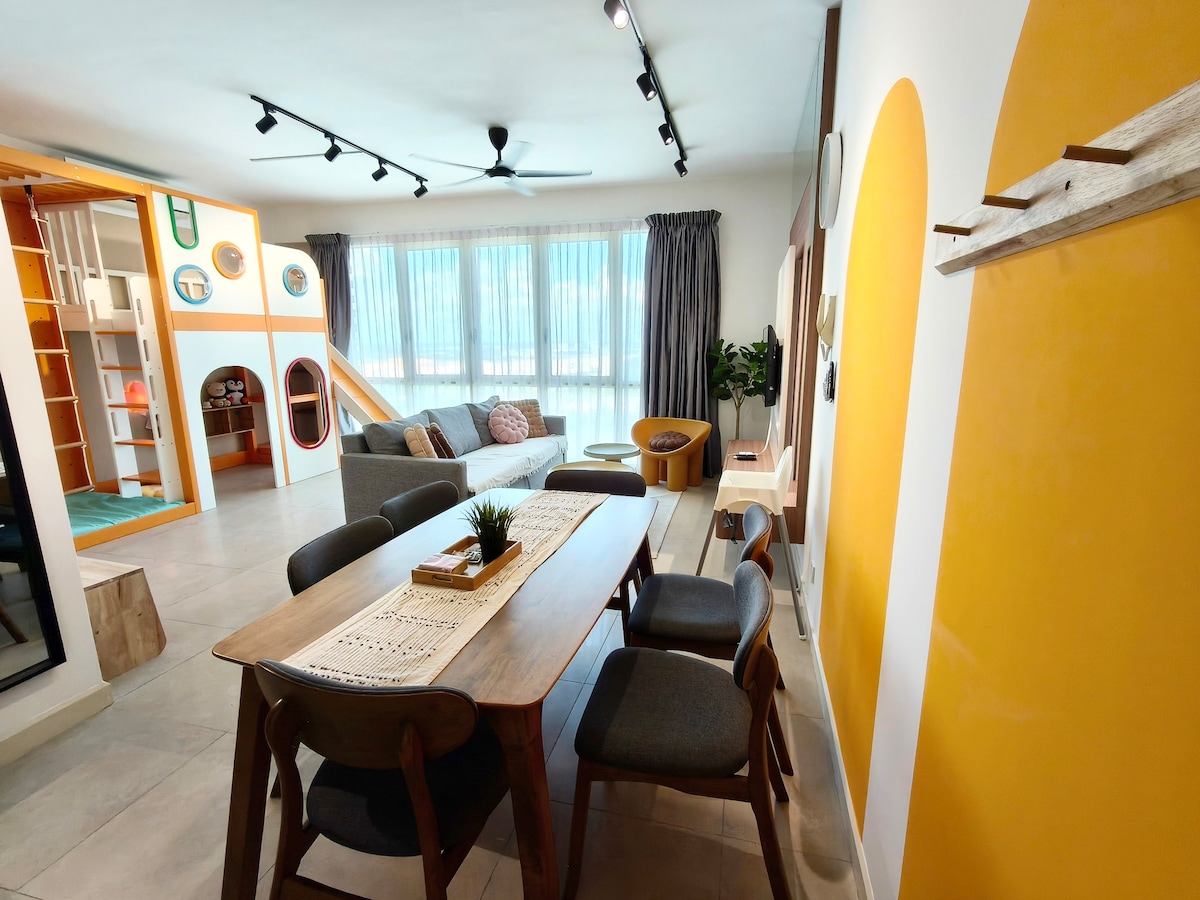 8 minutes away from Legoland🚗🧸 Walking distance 👣 to Sunway Big Box🛍️, GSC Cinema🎬, KFC, Starbucks, Family Mart, X Park, etc. Suitable for 4-6 people👪 In The Room 1 Queen Bed 2 Single Bed 1 Queen Sofa Bed Playground with Slide Living Room with Projector Dining Area Shower Room Kitchen In The Apartment Vending Machines Children’s Playground Swimming Pool Gymnasium Yoga Area Basket Ball Court Game Room BBQ Area