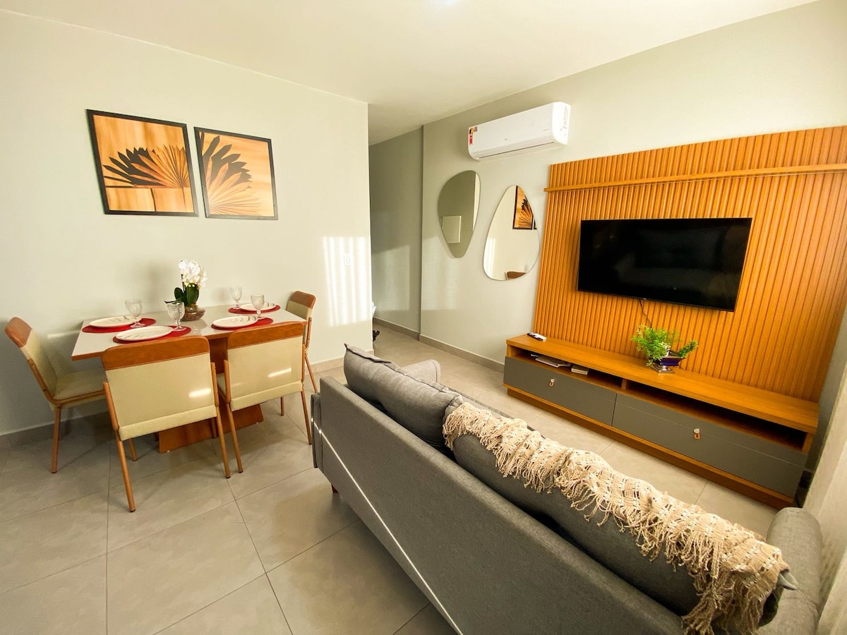 Relax in Apartment Garden: nicely decorated, perfect for children and quiet! Air conditioning and fan in all rooms, Wi-Fi, kids' space, fully equipped kitchen, covered garage and 20 m² of private garden. - 1 bedroom: Queen bed - 1 bedroom: 2 single box beds, which can be joined - Room with sofa, which can become a king-size bed By car, you take: - 4 min Marco das Três Fronteiras and Yup Star - 6 min Shopping Catuaí - 8 min to the center, restaurants and bars - 15 min Duty Free Argentina