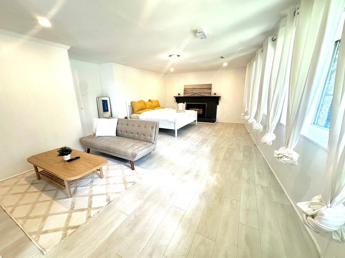 A peaceful, private space to relax, reset, and be inspired. Enjoy beautiful views of the mountains, water, and fairy lights — and most of all, good vibes. This luxury studio features a comfy king mattress, a big screen smart TV, and a low-profile writing table perfect for work or enjoying a cozy meal. Step out to the patio, where you can curl up with a book on the loveseat and watch the sunset in total tranquility.