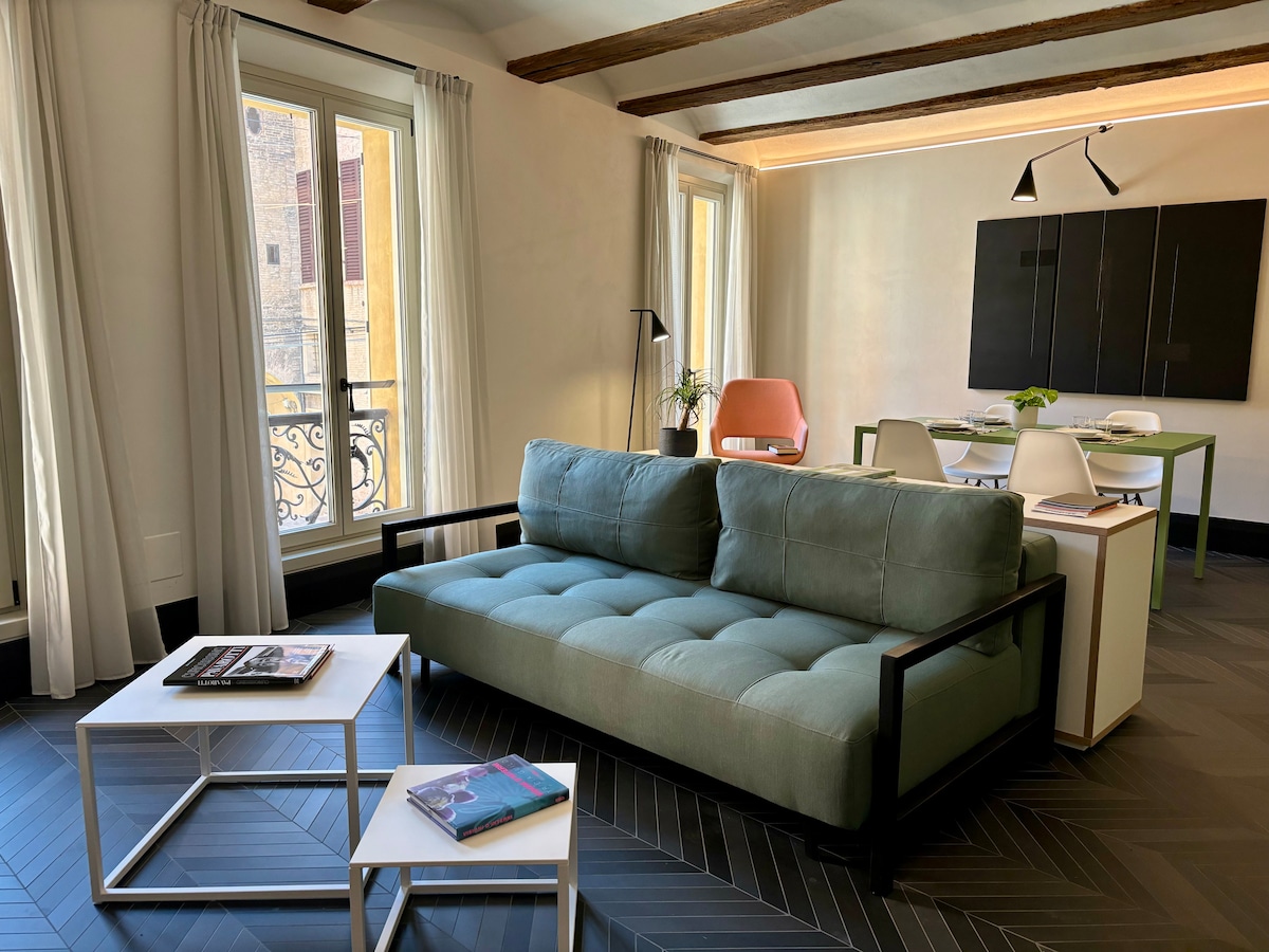 ★ FREE PARKING★ Flat with a view of the Ghirlandina located on the 2nd floor of a centrally located historic building in typical Modenese style. It is strategically located between the famous Albinelli Market and the splendid Piazza Grande. Inside the flat there are all the comforts needed to guarantee you a Luxory stay, whether you come for leisure or business. Smart 4K UHD TV in every room with Netflix, air conditioning, wi-fi, washer-dryer, dishwasher and safe.