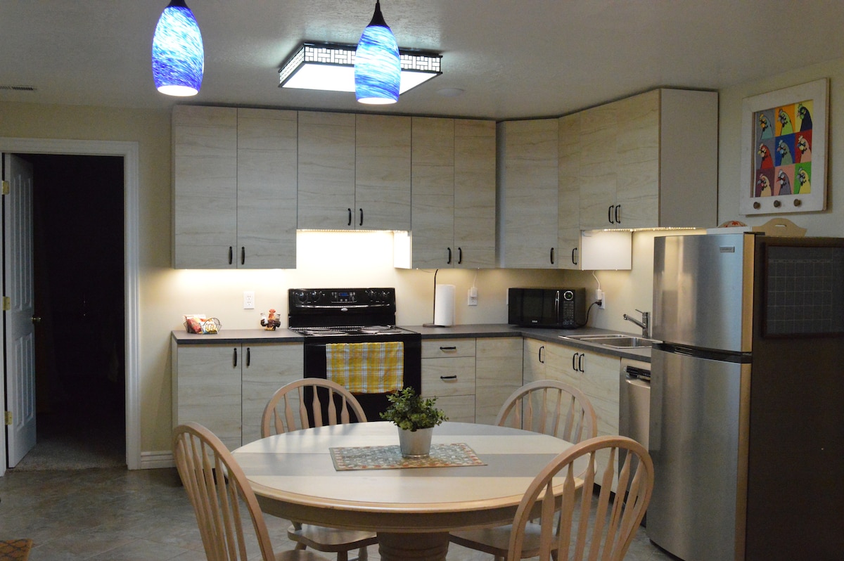 Why stay in a crowded hotel when you can enjoy this entire apartment?Located in a quiet neighborhood, with stunning views of the mountain, This 1200 sq foot downstairs guest suite is the perfect spot for your getaway or visit to Utah County! Within minutes of the Timpanogos Temple, shopping, American Fork Canyon, hiking and bike trails. Located centrally to 7 world class ski resorts with an approximate drive time of 30-50 minutes and midway between downtown Salt Lake City and Provo.