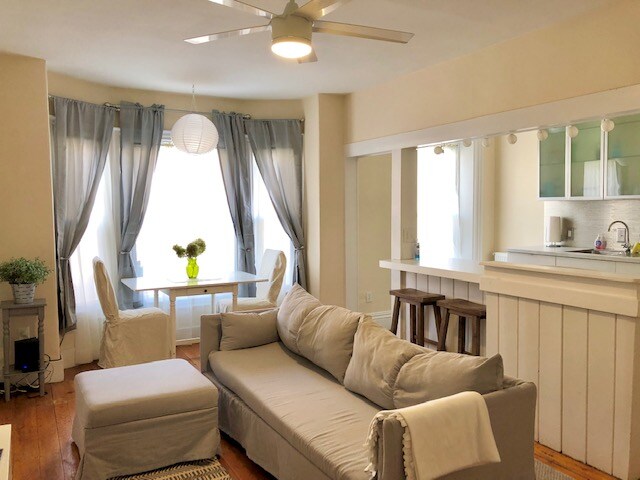 *Covid-Clean* Cook breakfast in a bright kitchen with robust hardwood floors in this calm Victorian home. Sit down at a traditional dining table in an open-plan room featuring vivid wood-paneled walls, serene decor, and a geometric rug with pops of blue. Bright and spacious with entire top floor privacy. ** NO SHARED SPACE** This is a dedicated Airbnb apartment with no shared space whatsoever. Ultimate privacy. This apartment can be rented as (1) bedroom for up to (2) guests or as (2) bedroom for up to (4) guests. It is $50/night additional cost for the (2) bedroom. Please confirm the second bedroom is available if interested. Either option has a full bathroom with claw foot tub and shower. Full service kitchen with stove, refrigerator and microwave for your private use. Large living room with (2) couches and flat screen. The very large master bedroom with the ultra comfortable king size mattress also has cable tv. . Both the one bedroom and two bedroom option have their own private entrance, private kitchen and bath on the third floor. No shared space with anyone else with either the one or two bedroom rental options. Private entrance. Spacious one or two bedroom apartment with full kitchen, bath and living room as well as other amenities. We are available for any questions or concerns but as a rule we give the guests their privacy. The house is steps away from some of Portland’s most popular eateries including the Knotted Apron, Woodfords Bar and Grill, Bird and Co., The Treehouse, and Elsmere BBQ. Not far to the Old Port area to browse seafood markets and shops. Visit the Portland Observatory to explore a historic lighthouse. Close to all public transportation and Portland International Airport Parking in the driveway is a possibility, please ask if interested. Street parking is available, it is based on an odd /even system of the street address. You want to be parked on the same side as the date would be at 12:01 AM on any given day. You are staying at 32 Lawn Ave