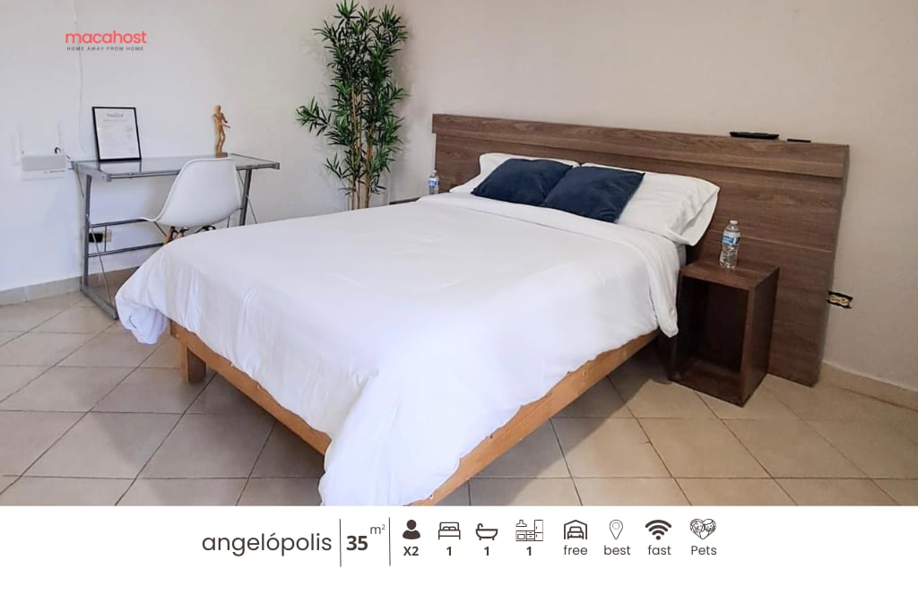 Privileged location, nice and safe area for walking. Comfortable, functional, cozy apartment, ideal for work or vacation. Totally private and independent. Roads: Peripheral, Straight to Cholula and Forjadores, to get you to the center of Cholula, Puebla, Angelópolis, Tonanzintla, Valquirico, VW, FINSA, Airport in minutes 400 meters from Explanada Puebla, you have cafes, restaurants, a cinema, gym, BBVA, shops, an entertainment center, skating, supermarket, etc. at your fingertips.
