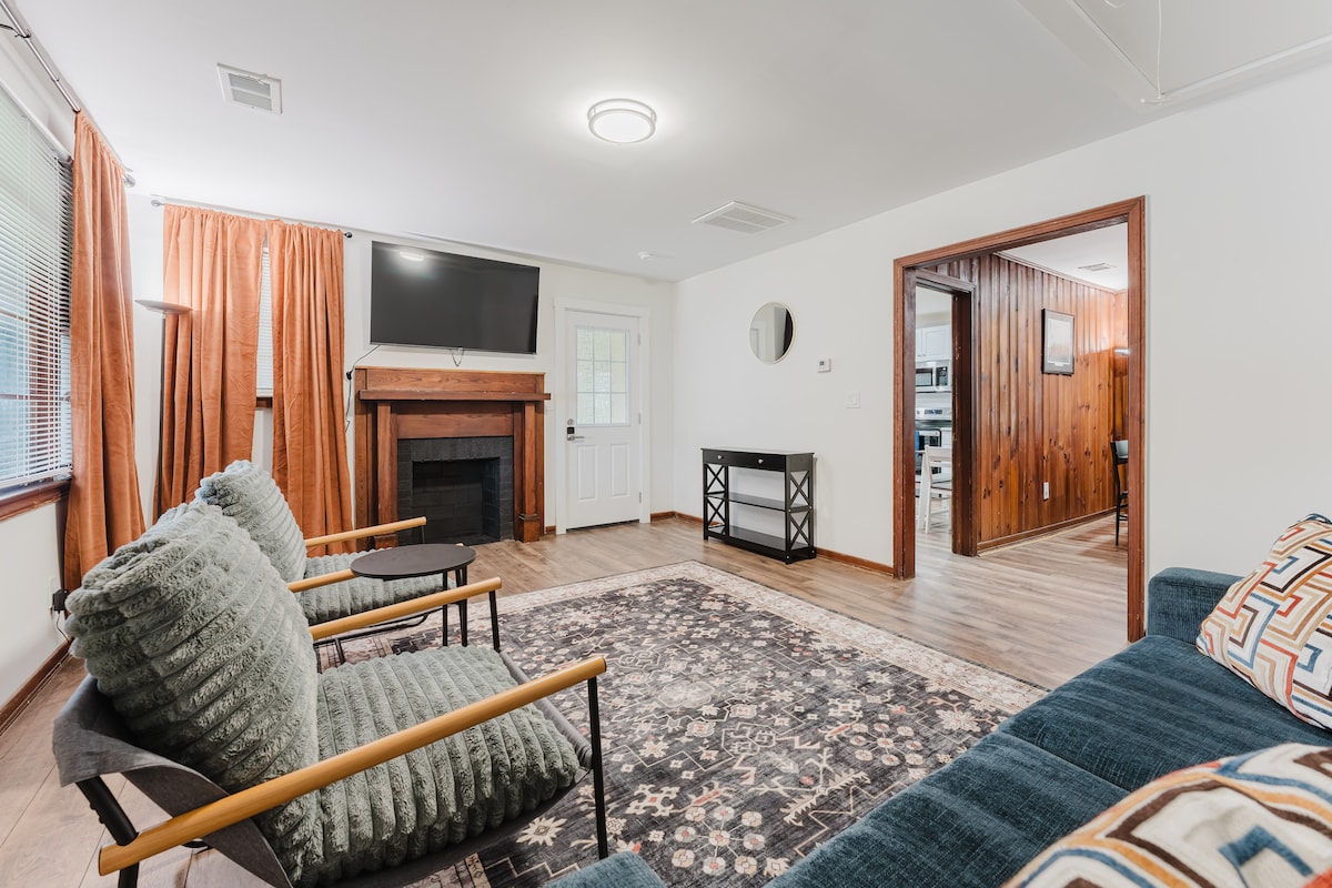 Enjoy a stay 3 miles from Main Street and the Swamp Rabbit Trail. Perfect for a romantic getaway or solo retreat, enjoy a cozy electric fireplace, a spacious king bed, and a fully equipped kitchen. The covered deck with string lights and outdoor dining sets the scene for relaxing mornings and intimate evenings. Thoughtfully designed for comfort, this peaceful escape keeps you close to top attractions.