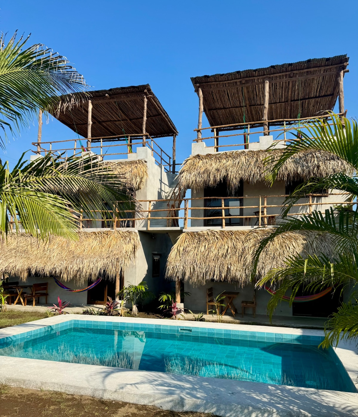 El Nido "the nest" is our little beach house. Perfect for a couple. Cozy for up to 3. One lot back from the beach, this two-story bungalow is conveniently located between the village and hotels. Just a few steps from the black Pacific sands, our breezy beach reprieve is an ideal setting for relaxation, surf, yoga or diving into a book. Open-air everything allows ocean breezes and the palm covered second story provides privacy while still having that open air feel.