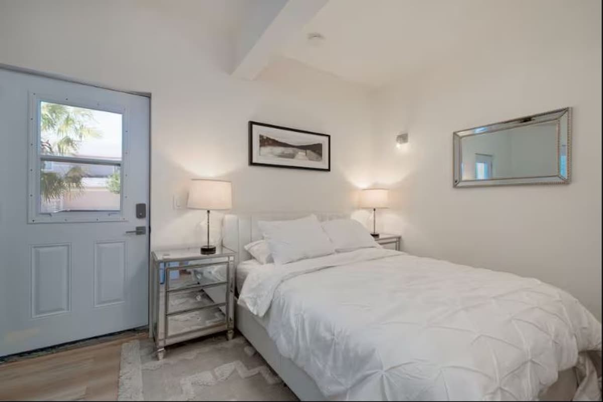 Sun-drenched private entry guest Cottage in tranquil Woodlake. Centrally located, 8 min drive to Midtown or 2 block walk to SacRT. Main room recently remodeled. Vibrant tropical bohemian accents abound. Spacious/open concept features a new queen bed, vintage furniture and a fully-functional 1950s kitchenette. Large, shared fully fenced backyard and patio with string lights, comfy couches and a farmhouse table. Complimentary bottled water and k-cups (creamer/sugar).