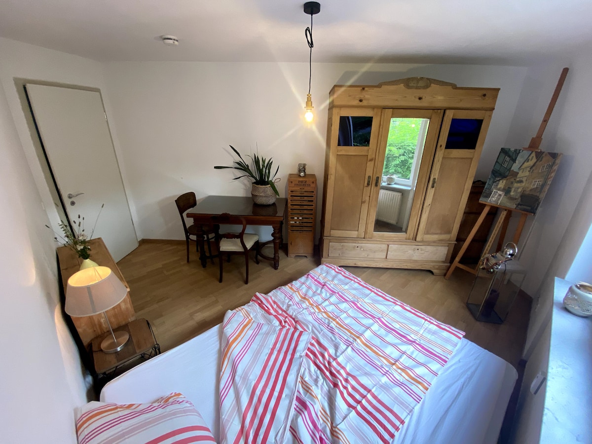 A narrow spiral staircase leads to the small apartment for max. 2 people. Double bed, bathroom with shower, small kitchen, view of the garden. Barbecue and terrace may be used. To the Waldschwaigsee about 400 m, to the bus stop about 200 m. My dog runs freely on the property. Dachau is 2 km away, Munich is about 15 km away.