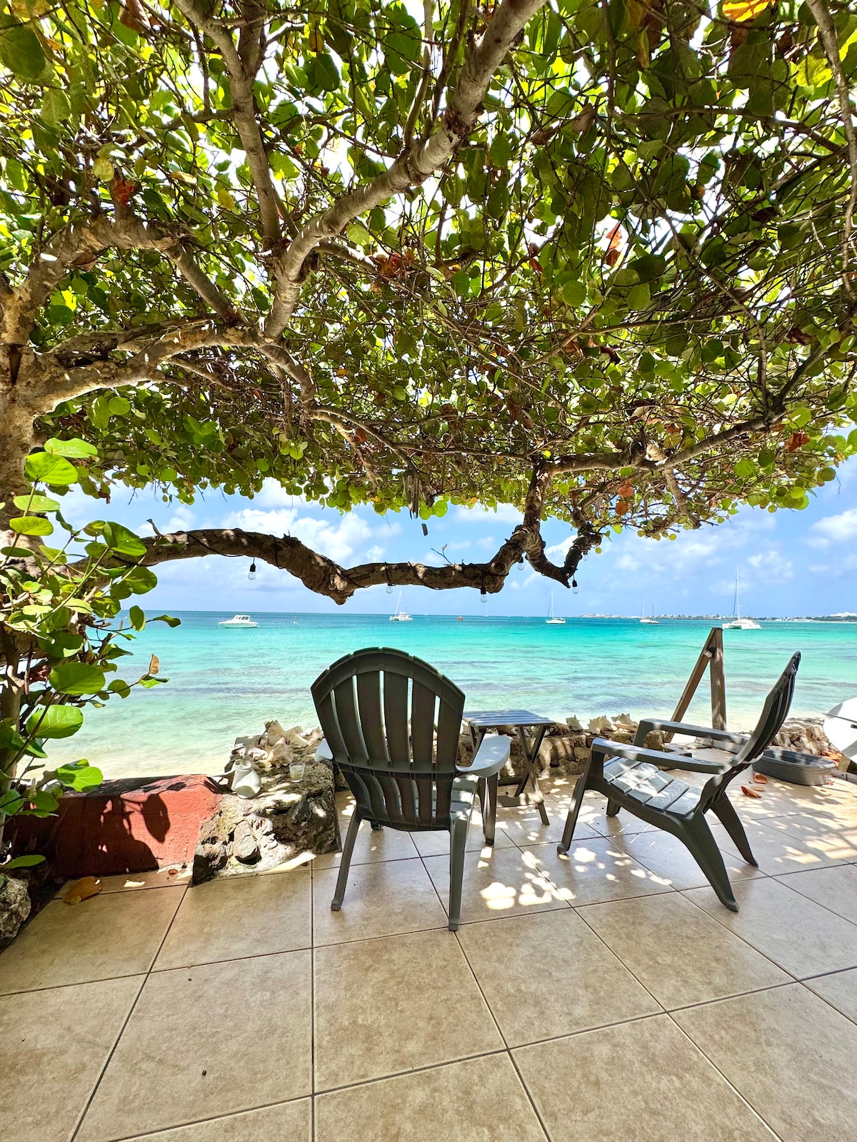 This new, full of charm apartment located on the beach, in the heart of Grand-case has its own sandy garden, beach chairs and direct beach access . Enjoy a stunning full view on Creole rock and Anguilla. It's a privileged spot in town and even in the island. Sea view from your bed, from the salon/kitchen area, wide covered terrace with sofa, red wood deck and gazebo covered with real braided palm leaves. True caribbean style! * Unique * * Unbeatable location * * High speed wifi * * Parking*