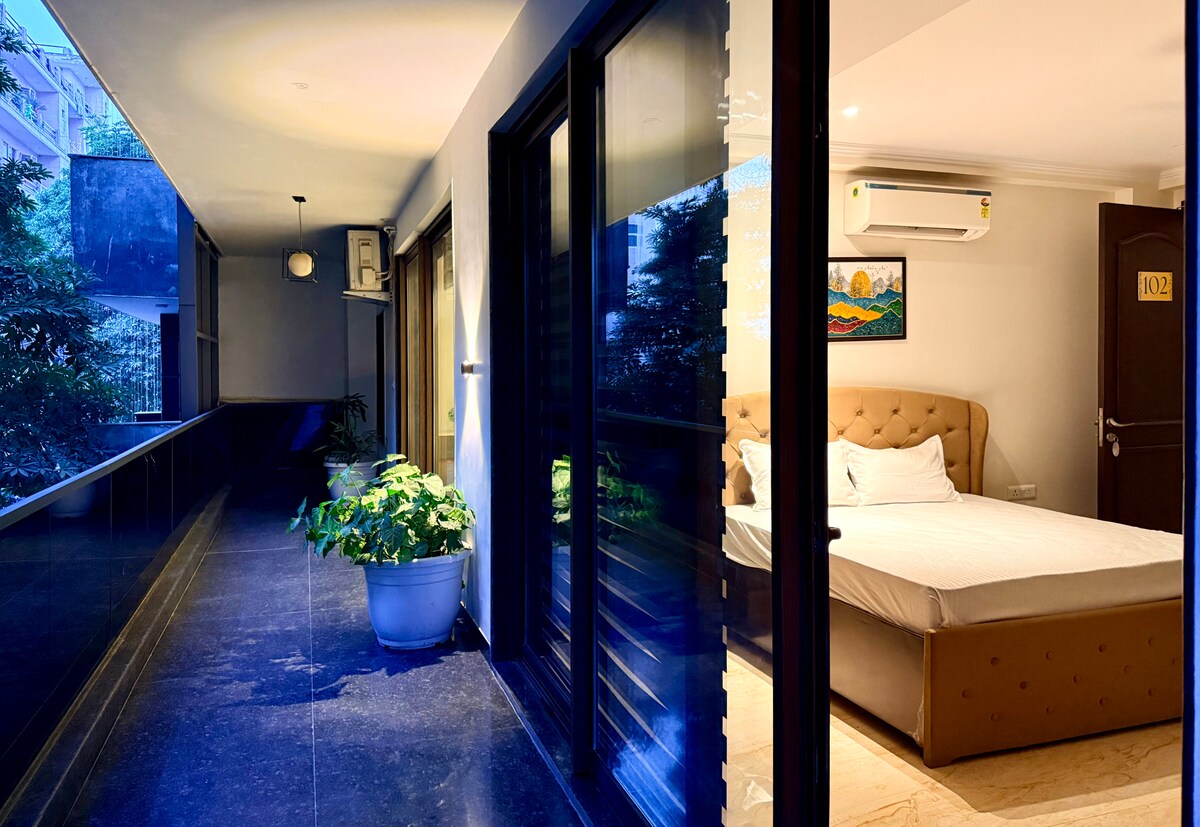 BLUO STAYS - Award-winning Homes! Awesome 1BHK Suite (550 sq ft) near Udyog Vihar, DLF CyberCity & MG Road with Lift & 100% Power Backup. Work From Home - Designer King Bed, 42" Smart TV, Bathroom & private Balcony. You also get a separate Living room with Couch & Dining Table plus Kitchen with Cooktop, Fridge, Microwave, Cookware etc. All-inclusive Daily Rentals - WiFi Internet, Netflix/Prime, Cleaning, Washing Machine, Utilities, Parking, Lift, Gym, TT, Pool Table & Terrace Garden..