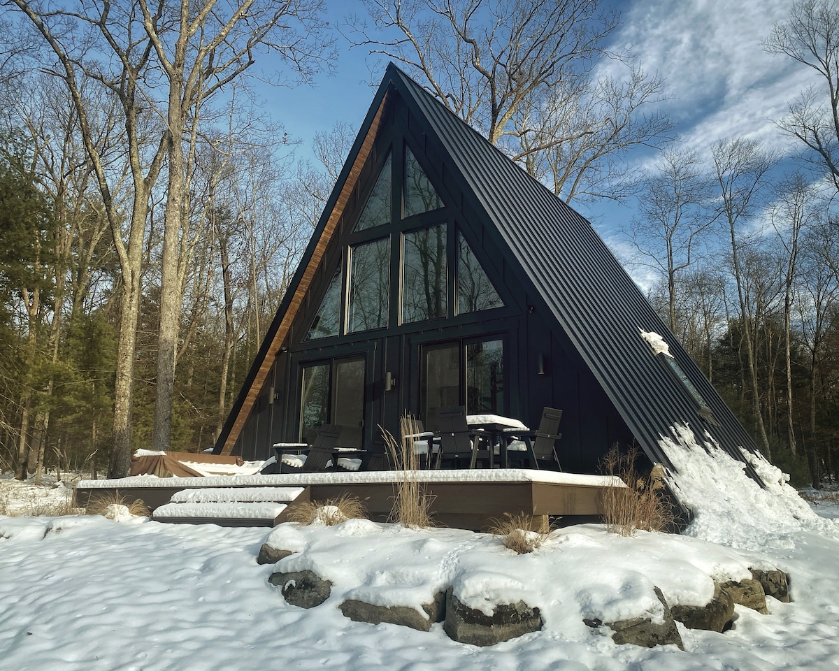 Escape to the Cedar Haven A-Frame in Damascus, PA – the perfect romantic hideaway just a short drive from NYC. Nestled in peaceful woods, this cozy 400-square-foot retreat offers all you need for a relaxing escape. Soak in the private hot tub, roast marshmallows by the fire pit, or unwind to music as you watch the forest through wide windows. Whether celebrating a special occasion or just needing time away, the tiny cabin invites you to unplug, reconnect, and make memories in nature’s embrace.