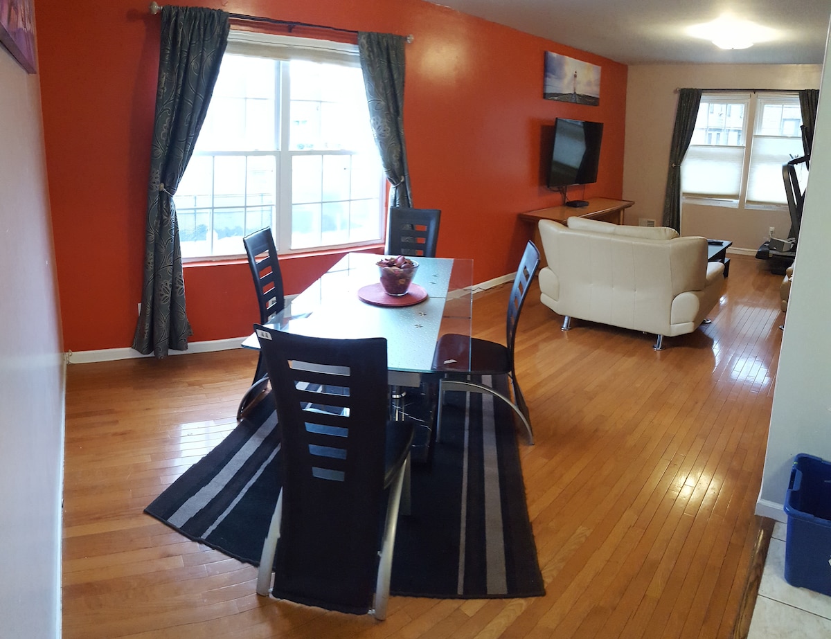 Enjoy a stylish experience at this centrally located suite which is completely private as it's in our basement with your full bathroom and offers a private entrance. We live on the main floor of our home which is a quiet area. NYC 25min on the 114/113 bus, Newark Airport 7Min, and many restaurants and stores. Workspace is available - The WIFI is super-fast! - The suite is equipped with central air, cable tv including Netflix, etc. – Free Parking I'm sure you will have a great time!