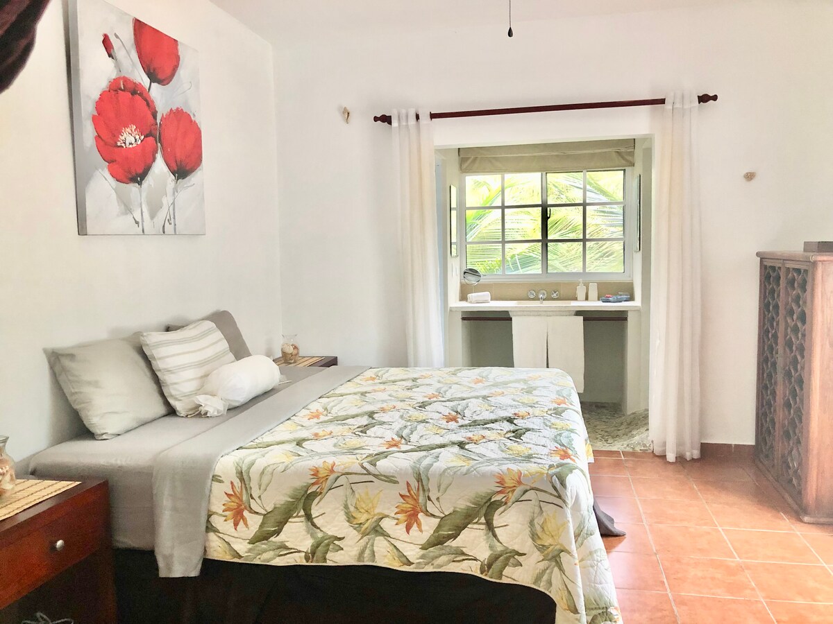 750ft/250m to the BEACH Playa Popy. Tropical style Cabaña in a small B&B of 3 bungalows. Features an outdoor patio facing a lush garden with natural swimming pool. King size bed, daily room service, full bathroom with toiletries, ceiling fan and A/C. Secured parking area. Breakfast available (extra). Common fridge/freezer, coffee maker, flatware. No kitchen! Walking distance to beaches, town, shops, restaurants and bars yet in a quiet and safe residential area. Suits nature lovers!