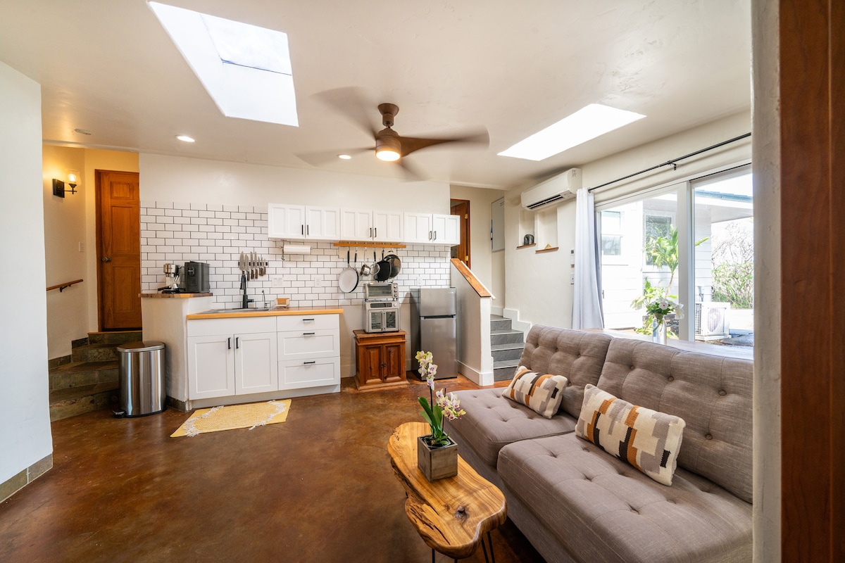 Our Sunflower suite. This cozy one-bed and one-bath is most comfortably spaced for an individual or an intimate couple. Keep it simple at this peaceful and centrally-located place. Come on in through a private and dedicated entryway into your own kitchen and living room area as you unwind from the beautiful island day. Walking distance to boardwalk along the shore. Also enjoy the walking distance to Church, Foodland, Shops, Restaurants, Nightlife, Movie theaters, Starbucks and beaches.
