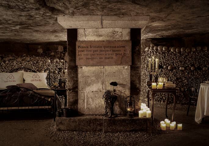 Before bedtime, a storyteller will have you spellbound with fascinating tales from the catacombs, guaranteed to produce nightmares. Finally, enjoy dawn with the dead, as you become the only living person ever to wake up in the Paris catacombs.
