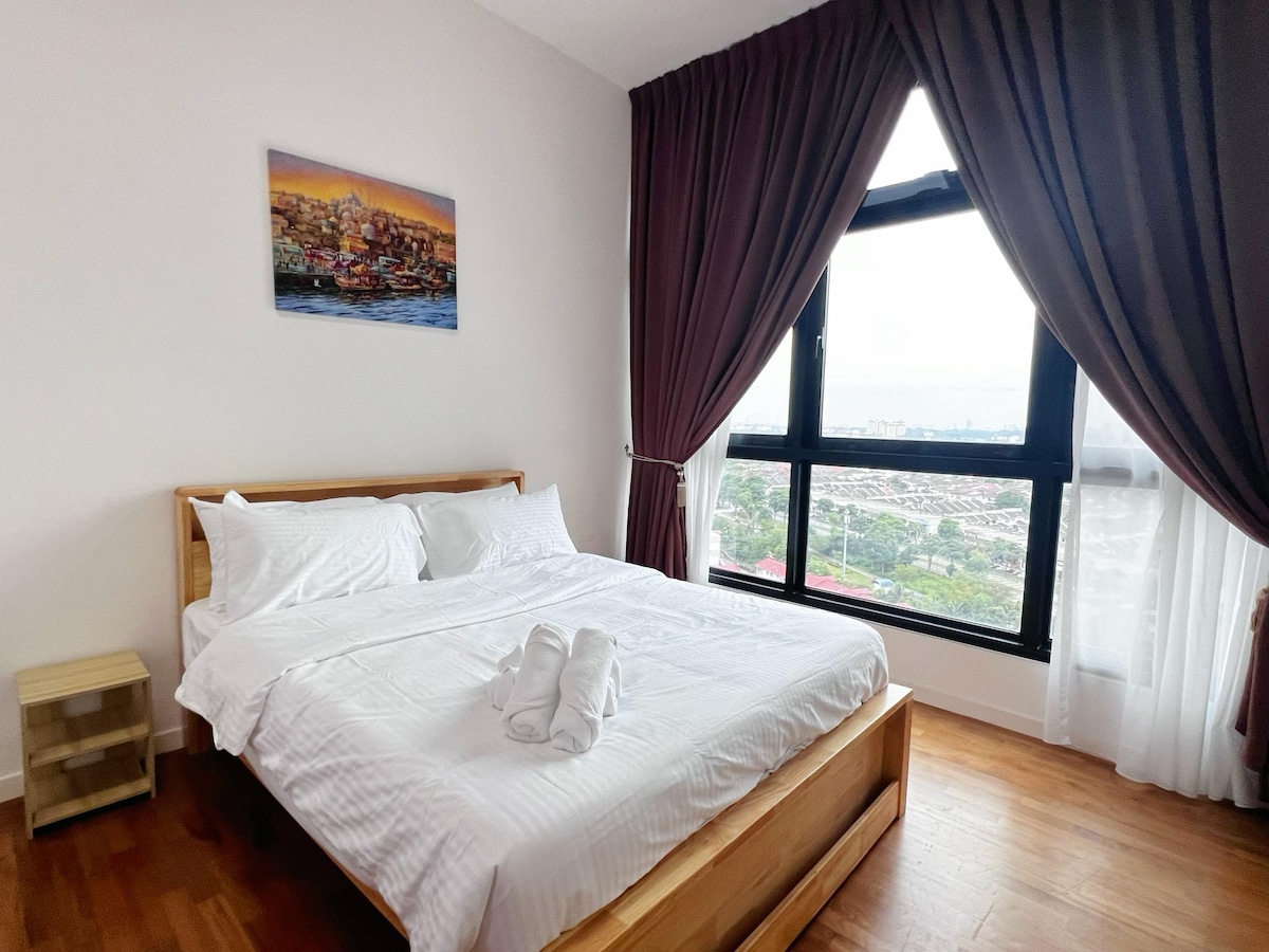 Stay at a new 2 bedroom condo on the Penthouse floor of Harbour Bay Residence. With high ceiling of 3.2 meters this condo is special and has a very roomy feeling; only available at the top floor of the property. Stunning views over Harbour Bay and the city. Fancy LED lighting for chilling night time atmosphere. Nice balcony with sitting arrangement (Hello smokers; you can smoke on the balcony but strictly no smoking in the condo). Wooden writing table in bedroom 2 for work from home.