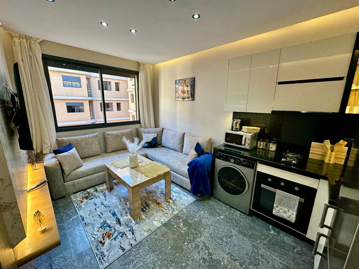 Apartment in Marrakech: comfort and modernity. Located in a quiet area, close to the essentials: 2 min from McDonald's 10 min from Grand Stade de Marrakech 8 min to Jardin Majorelle 10 minutes from Gueliz Bright home with: Cozy living room (Netflix included) Equipped kitchen Bedroom with queen-size bed Modern bathroom 2 balconies Ultra-fast fiber optic Wi-Fi. Private access for a peaceful stay. Moroccan regulations: marriage certificate required for local couples.