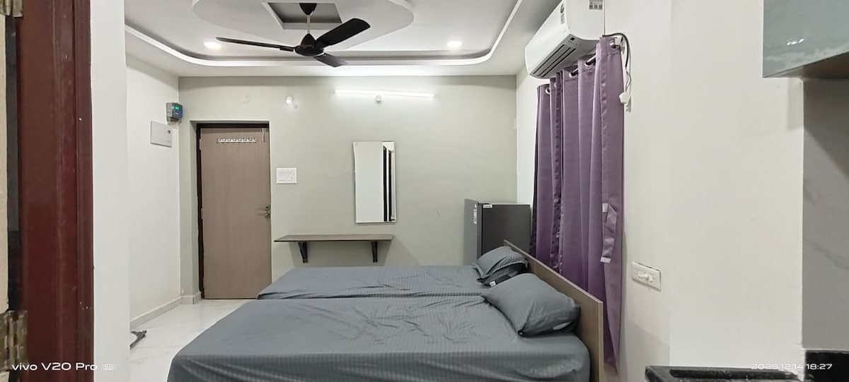 Experience a peaceful stay in this well-maintained 1BHK ground floor portion of an independent house in a serene residential neighborhood. Ideal for professionals and business travelers, who love comfort and quiet surroundings. ✨ The Space One living hall One functional kitchen One furnished bedroom with queen-size bed, wardrobes, one attached bathroom and wash basin. One detatched bathroom One wash basin in the dining area Non-AC home (naturally cool in winters) Air cooler can be provided