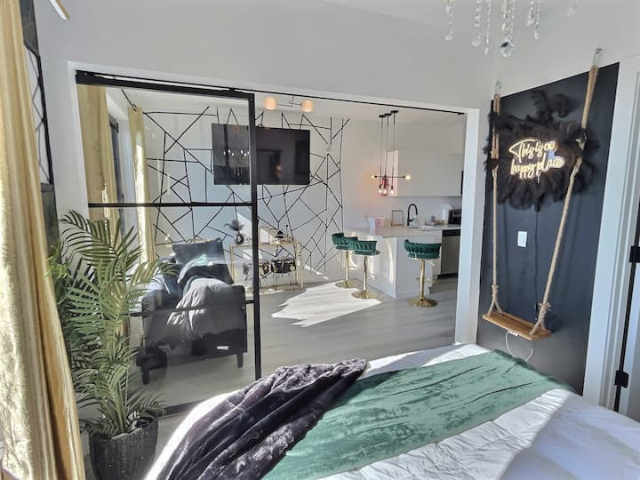 We just know you're going to love your stay at our Luxe Glass house .Get a good nights rest on our Queen pillow top mattress. Walk into a custom mirror background including a beautiful crystal chandelier in the bedroom . Glass barn door adjacent to our Luxurious swing complimented by a bright LED sign for photos .Just 7 minutes away from EWR & 27 mins from NYC . Enjoy a beautiful city skyline view with our oversized windows ! We are dedicated to giving our Glass House guest a 5 star experience!✨
