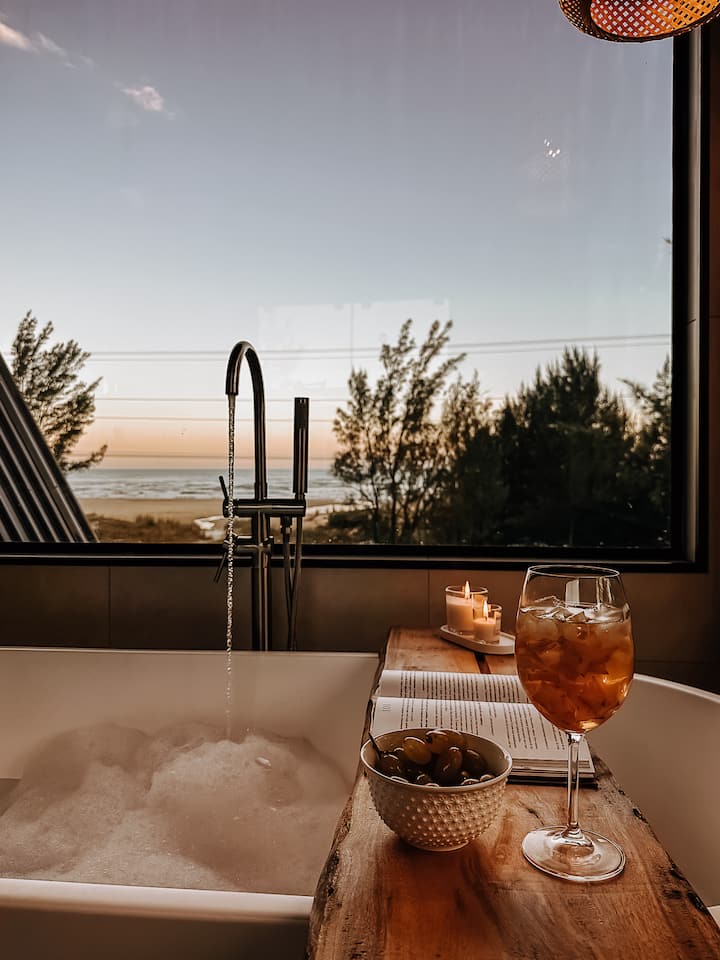 There are more than 100m2 of built area for you to enjoy.. We prioritize the stunning view available, so you'll be able to see the sea from the living room, outdoor fireplace, grill, bathtub and bed!