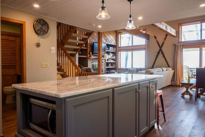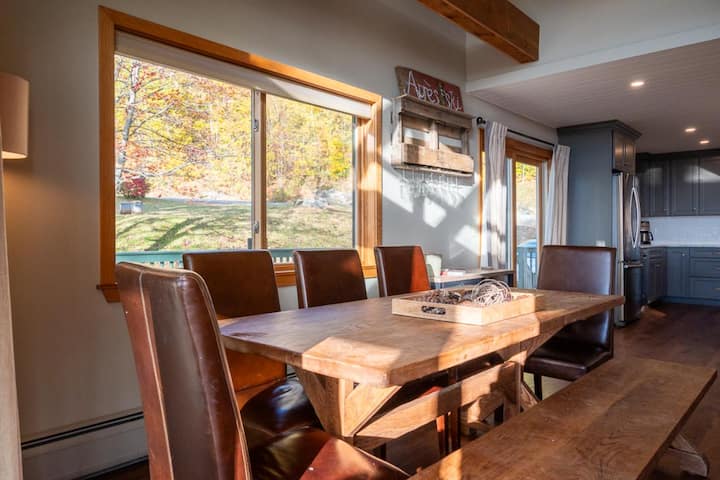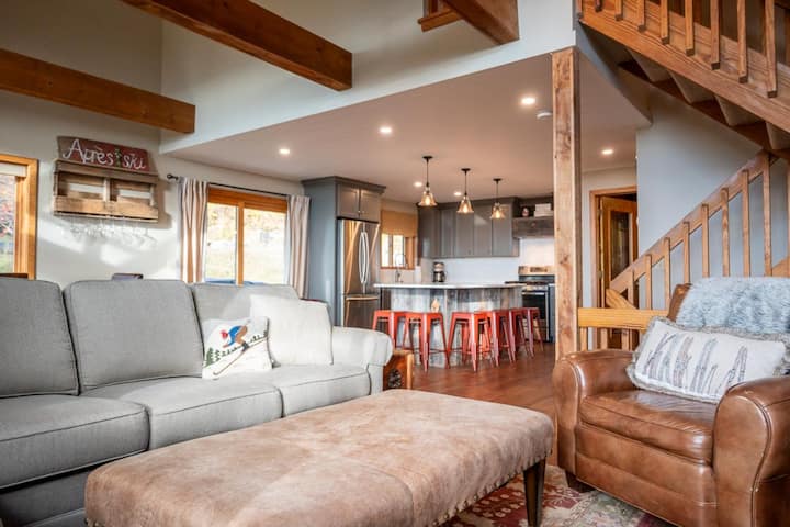 Entering into the main living level of Trailside 39E, the open-concept floor plan is cozy and bright. The large living room features, high ceilings, comfy couch seating, games, wood storage, and large windows. The large updated kitchen has a beautiful island with seating for six, along with new appliances, a coffee maker, an oversized sink, and well-equipped with everything you need for vacation meals. The dining room has seating for eight guests at the big farmhouse table surrounded by windows. Plus, the mini bar is ready for your weekend essentials! The two sliding doors to the outdoor space are accessed through the dining area where you'll find a large wrap-around deck with seating and awe-inspiring views.