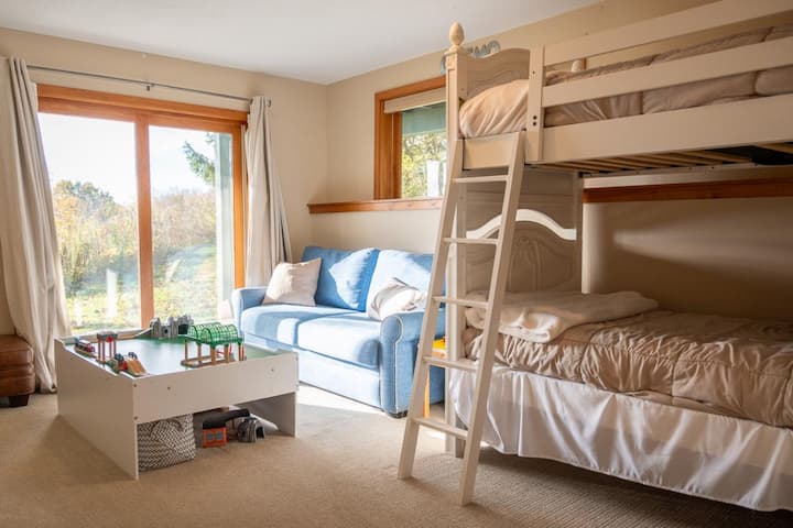 The lower level has three bedrooms, including a bunk room that doubles as a playroom for the kids. The first bedroom features a queen-sized bed with closet space and a large window with views of the mountains. The second bedroom features another queen-sized bed with a television and window views. The third bedroom is the bunk room with a twin-sized bunk, a couch, a game table, and sliding doors allowing you to walk out on the ground-level patio. Additionally, there is one full bathroom on this level.