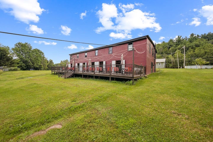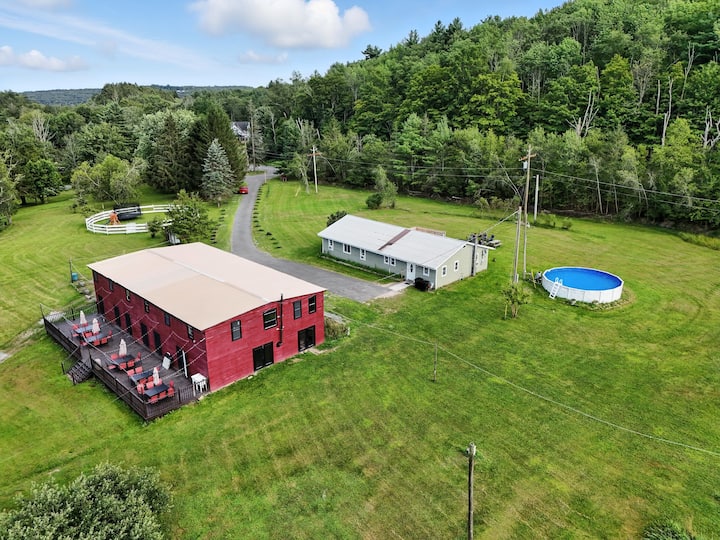Escape to our enchanting Catskills retreat featuring three cozy homes and a 5,000 sq ft barn. Each home includes a fully equipped kitchen, cozy living areas, and private patios. Outdoors, enjoy hot tubs, a serene stream, a private lake, a playground, and open grounds that set the stage for unforgettable moments. Perfect for weddings, reunions, or retreats, it accommodates 45–50 guests, with extra beds available. The ideal setting for creating lasting memories in comfort and nature’s beauty!