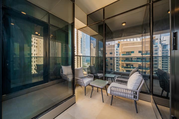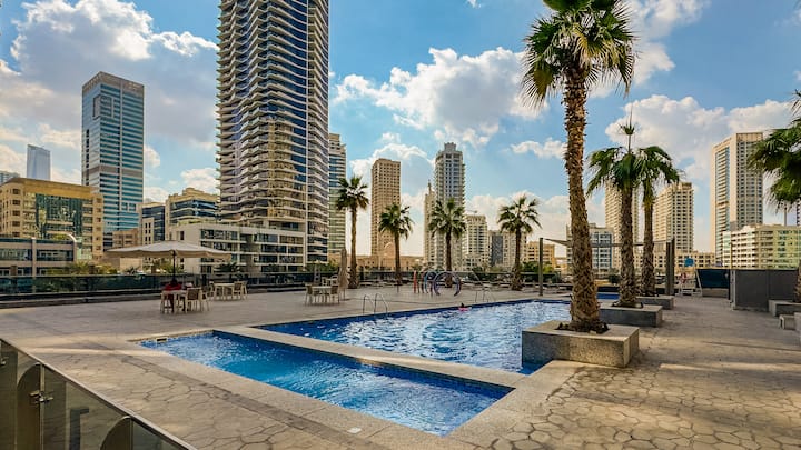 5 min to JBR Beach, steps from tram, metro & Marina Walk. rooftop infinity pool, sauna, gym & 24/7 security.