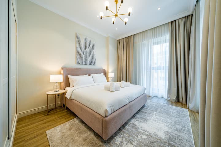 Relax in a fantastic king-size bed with an ensuite bathroom, a 65” Smart TV, and a fully equipped kitchen. The rooftop infinity pool, sauna, gym, and children’s playground complete this elevated Dubai experience.