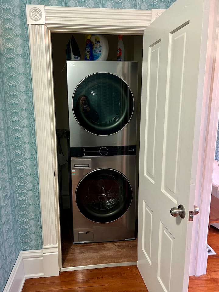 Our newly renovated, modern bathroom includes all of the basic amenities you may need including towels, shampoo, conditioner, body wash, and a hair dryer. There is an in-unit washer and dryer available for guests to use at their leisure with an ironing board available in the laundry closet.