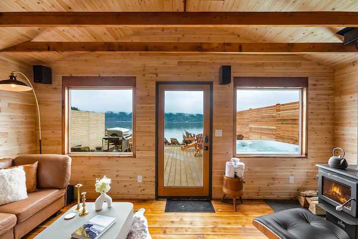 Enjoy gorgeous water views with luxurious seating and a wood burning fireplace. Our brand new kitchen provides all the essentials for cooking. Our appliances (oven, dishwasher, and fridge) are compact and not full-sized, but are designed to be sufficient for meals for up to 4 people. We have a stovetop and essential appliances (coffee maker, blender, toaster, cookware and utensils) and do not have a microwave. "Cowhide" rug and "leather" couch are faux.