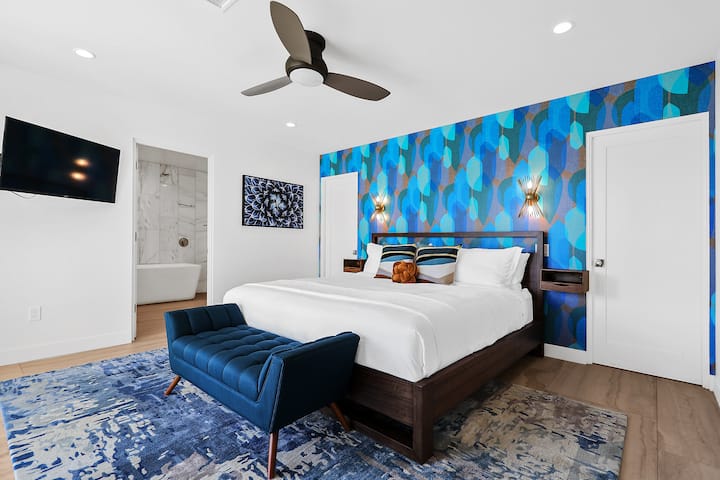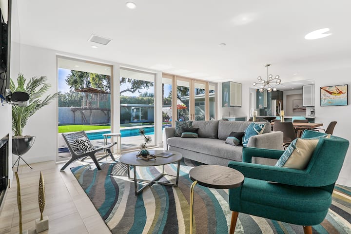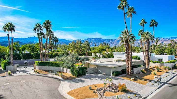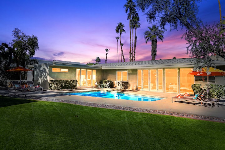 Enjoy the peace and spaciousness 'The Fairway Estate' offers while keeping the classic old Palm Springs alive. The space is ideal for families to be together while each room provides a generous amount of space and privacy for each guest. The common areas promote togetherness whether that’s splashing in the pool, sitting around the fire pit discussing stories-of-the-day, enjoying a competitive game of pickle-ball/ping-pong/or foosball, curling up on the couch to watch a movie, finding your inner chef in the kitchen or sharing a meal at the 8-seat dining table, the possibilities are many…