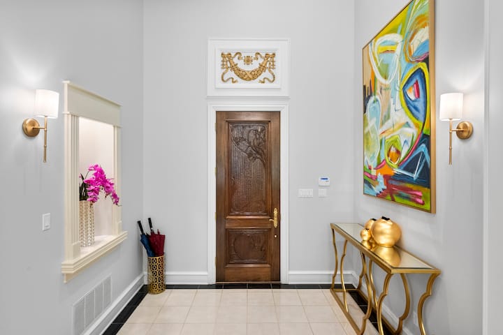 Step through the hand-carved door into the foyer adorned with modern art, offering a glimpse of the piano room where you can unwind in serenity. The dining area, exuding country sophistication, accommodates up to 10 guests in the formal area and up to 10 guests in the casual area for memorable meals.