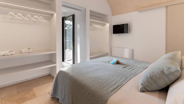 Villa Belkis is a modern-style villa located in the countryside between Ostuni and Ceglie Messapica, in the heart of the Itria Valley. Surrounded by large land with olive trees, Mediterranean shrubs and aromatic herbs, it offers an ideal setting for relaxation. Built on one level, the villa combines traditional and modern materials, with classic stone vaults and thick white walls that create fresh and comfortable environments.