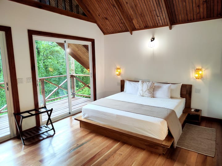 Upstairs, you’ll find a spacious master suite with a king bed, an open-concept bathroom with jungle views, and a serene atmosphere designed for rest and connection. Downstairs, there’s a comfortable living area with a sofa bed, a fully equipped kitchen, and a second full bathroom, offering the perfect balance of style and functionality.