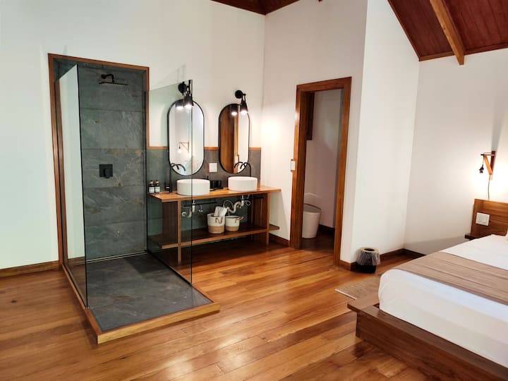 Upstairs, you’ll find a spacious master suite with a king bed, an open-concept bathroom with jungle views, and a serene atmosphere designed for rest and connection. Downstairs, there’s a comfortable living area with a sofa bed, a fully equipped kitchen, and a second full bathroom, offering the perfect balance of style and functionality.