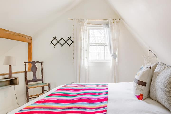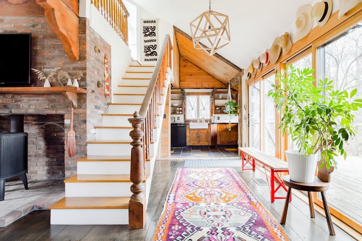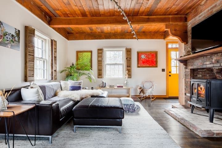 The Cottage is a loungy den, perfect for city folk seeking to unwind & recharge. Surrounded by natural beauty, our solar powered home features wood finishes, beamed ceilings and an exposed brick hearth with a wood burning stove. It's decorated with pops of bright color and items collected from our travels around the world. Watch a movie, nap in the hammock and relax in the soaking tub under the skylights. Explore the 4 acres, enjoy s'mores by the creek or stroll to Tivoli for excellent farm-to-table meals and drinks. *Our home shares the property with our Barn: www.airbnb.com/h/thebarnintivoli