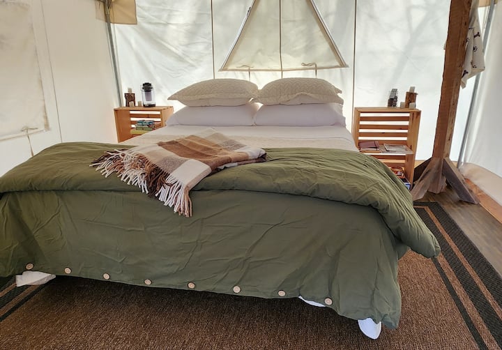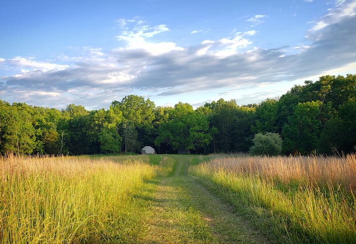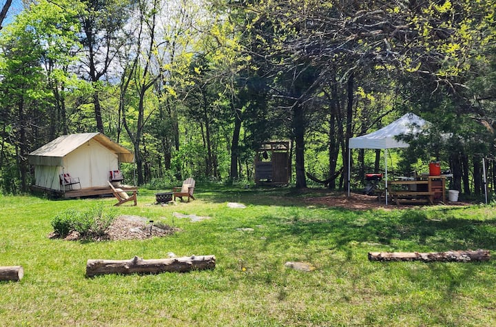 Camp under the stars at one of our private, outfitted campsites! Our canvas wall tent is all set up and ready for you to come and get away from it all. Drive right up to your site and enjoy the seclusion of 60 acres almost to yourself, with walking paths, creek access, and a campsite to make memories at. Whether you're looking perfect spot for a solo or couple's getaway, or a place for a family gathering, we would love to host you at Evensong Farm! No cleaning/service fees!