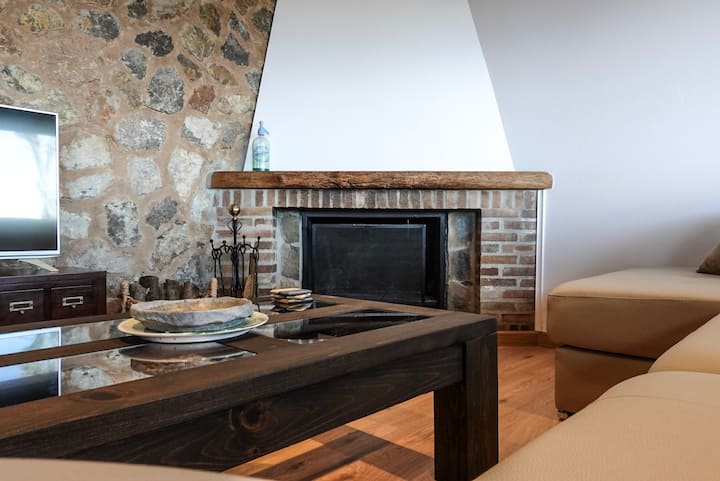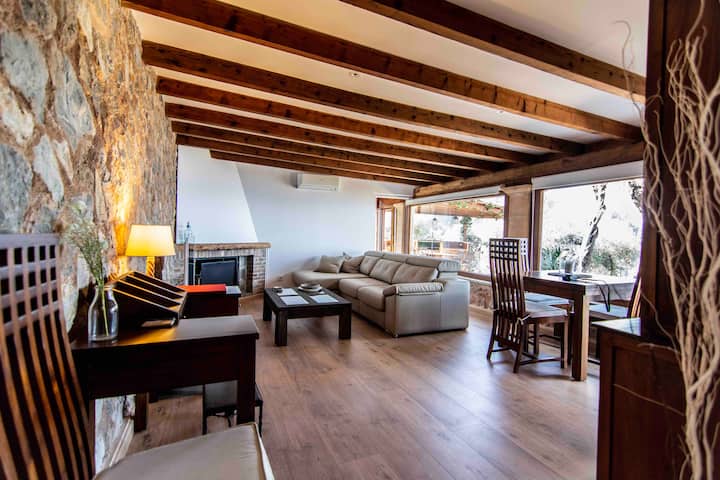 A spacious and bright living room, includes: dining table, electric radiator and fireplace. Air conditioning with a cold air pump and heating. Double doors (climalit) and large bright window where you can enjoy a terrace with stunning ocean views along the mountains. A sofa by the fireplace, 43'' smart TV, satellite TV, Netflix with free movies and documentaries, Bose SoundLink Bluetooth speakers to connect to your iPhone, etc.
