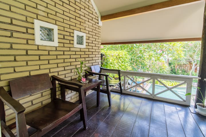 We have three individual and separate rooms/bungalows, in a tree filled garden setting right in the middle of south Ubud Town.