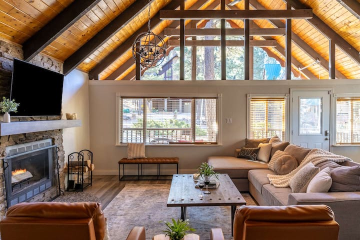 Escape to our spacious 4-BR A-frame cabin in Flagstaff! Perfect for families & groups, this retreat features a private hot tub, stone fireplace, A/C, and a game loft. Nestled in the pines just steps from forest trails, it offers a modern cabin vibe with a fully equipped kitchen and dedicated workspace. Enjoy mountain views from the deck and relax in comfort and style. Comfortably sleeps your group for the perfect mountain getaway.