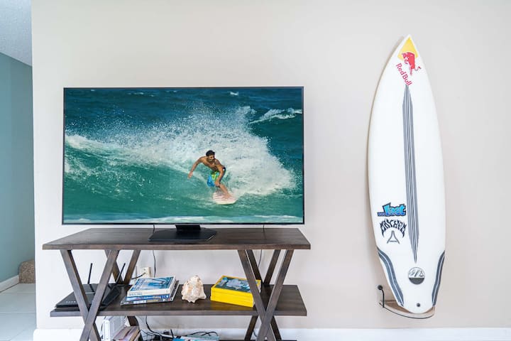 Step inside and relax in the inviting living area, designed with a comfortable coastal feel and plenty of space to gather. This well‑appointed room features a leather queen sleeper sofa, an oversized accent chair, and a coffee table, creating a comfortable setting to unwind after a day at the beach. Enjoy movie nights or gaming on the large Smart TV, complete with an Xbox and controllers, or browse the bookshelf stocked for added entertainment. A ceiling fan helps keep the space comfortable, and the living area opens directly to the back patio, making it easy to enjoy indoor‑outdoor living.