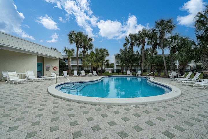 Just steps from the back patio, guests have easy access to the community pool—an ideal spot to cool off after a beach day. Whether you’re taking a refreshing swim or relaxing poolside, this amenity is located right nearby and also features on‑site restrooms for added comfort.