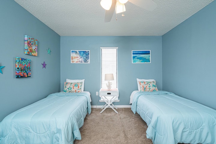 The second bedroom includes two twin‑size beds, a large closet, television, ceiling fan, and two bean bag chairs, creating a flexible and comfortable space for kids or additional guests. Also features a large window that brings in plenty of natural light.