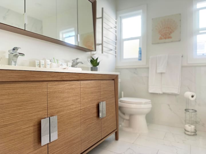 𝑩𝒂𝒕𝒉𝒓𝒐𝒐𝒎 #𝟏 en-suite, walk-in shower, starter essentials including towels, toiletries, and toilet paper, sufficient for initial days of the stay.