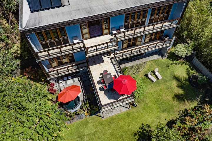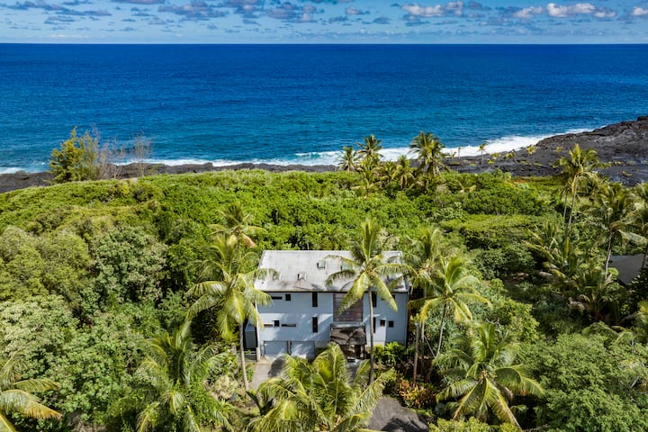 Kalapana Beach Haven is a stunning 3 level custom-built tropical modern home that overlooks the ocean at the end of a cul-de-sac. With no direct neighbors, this retreat offers privacy with only the sounds of nature and the ocean. The house is surrounded on three sides by jungle with a path leading to the ocean a hundred yards away.