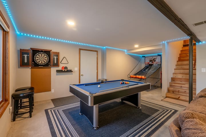 The lower level offers a multitude of fun game room and arcade style options, as well as additional living space with a sectional couch, TV, and a walkout door to the hot tub and massive yard below the deck.
