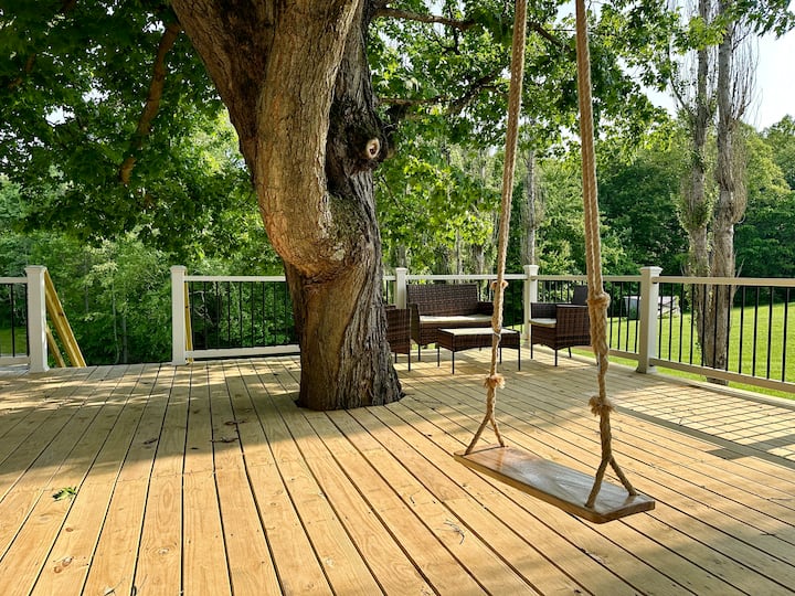 -Second “tree house” style deck with wooden tree swing and patio furniture