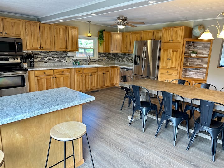 Spacious house on 3.5 acres. Accommodates up to 14 people (1 king, 5 queens, 2 twins), this house has all the modern amenities for a good time. With big living room, fully equipped large kitchen, and comfy bedrooms with Smart TVs, this is the perfect retreat for your big group seeking adventure and relaxation. Whether you’re looking to unwind in the hot tub, roast marshmallows by the fire, or take in the nature views, Moonville Manor is your ultimate Hocking Hills getaway.
