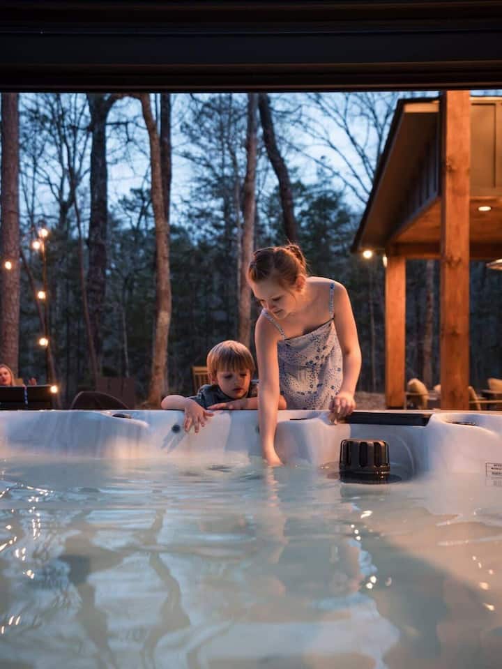 Nestled in a serene wooded enclave, our contemporary residence boasts designer decor, offering a perfect blend of style and comfort. Revel in the breathtaking vistas of Blue Ridge Lake, immersing yourself in the tranquility of this wooded paradise. Experience outdoor relaxation in our spacious 7-person hot tub, complemented by a cozy fire pit and inviting outdoor living room.